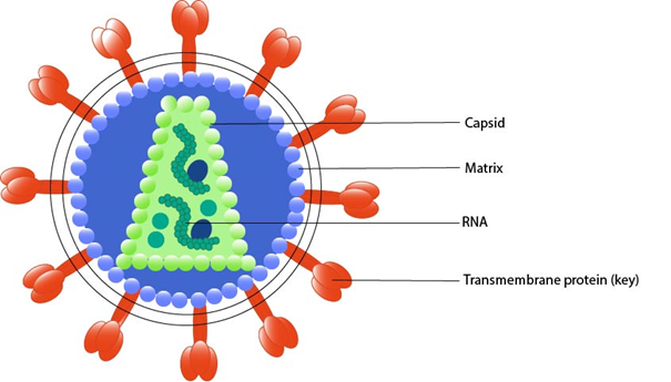 This virus, originally found in monkeys, is responsible for the disease called AIDS. It is a lentivirus of the retrovirus family. This means that when we observe it, we first see a sphere with several keys on its surface that allow it to attach itself to cells to better contaminate them. Beyond this first barrier, a second one is detected containing and protecting proteins and genetic material. This genetic material is not in the form of DNA (like us), but of RNA. The RNA is one of the steps allowing to produce proteins from the DNA.