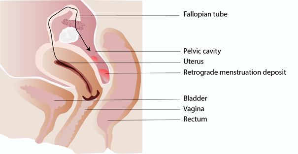 When a woman has endometriosis, her endometrial cells will migrate into the fallopian tubes instead of being evacuated with menstruation, and thus become lodged in the pelvic cavity.