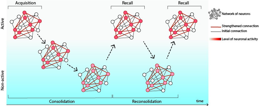Scheme of the different stages of episodic memory. Each memory is stored in its neuronal network, called engram, in which the neurons show specific activity. This network oscillates between an active state during acquisition and recall phases and a non-active state during consolidation/reconsolidation phases (scheme inspired by Josselyn et al., 2015).