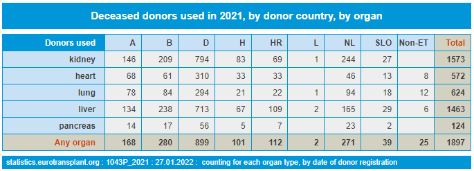 Table 1: Number of deceased donors allocated in 2021, by country and by organ. Note that one donor could provide more than one organ for transplantation.