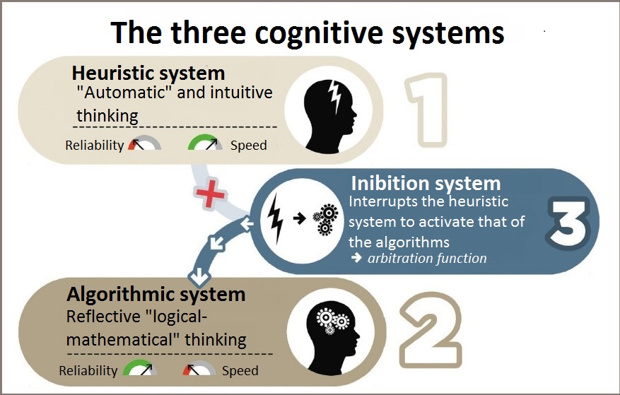 The brain has two computational systems for solving problems and making decisions: heuristics and algorithms. If heuristics are quick and intuitive logic, algorithms require mental effort and much deeper analysis, but they certainly lead to the right result. In some cases heuristics are so quick that it prevents us from being logical and rational. A third system must intervene to resist heuristics and activate our logical-mathematical thinking. This is inhibition. In the prefrontal cortex, this third system is, according to psychology professor Olivier Houdé, the "key to intelligence". Its arbitration function allows at the appropriate times to interrupt the heuristic system and activate the algorithmic system.