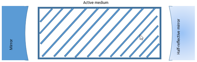 The LASER cavity is the part that contains the active medium and allows the flux to be directed. At one end of the cavity there is a mirror, opposite this at the other end of the cavity there is a semi-reflecting mirror (the output mirror). During the pumping phase, the photons emitted by the different electrons will "bounce" back and forth in the cavity against the mirrors. If a photon hits one of the two mirrors, it is reflected back to the other side of the cavity, and must therefore pass through the active medium again. As a result, it can still participate in the stimulated emission. This is how the snowball effect is created, and thus the amplification of the light.