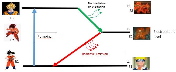 Our two characters will go from the E1 stage to the E2 stage after having absorbed energy (a photon E=Hv). Then they will use this extra energy to launch super attacks (kame hamé ha, razengan, etc.), but after having spent a large amount of energy, they will fall back to their starting level.