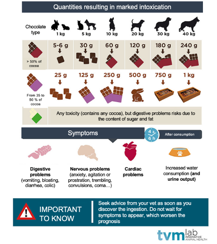 Poster showing the amount of chocolate that causes marked intoxication (source : https://www.tvm.fr/expertises/gestion-des-intoxications/intoxication-attention-au-chocolat/)