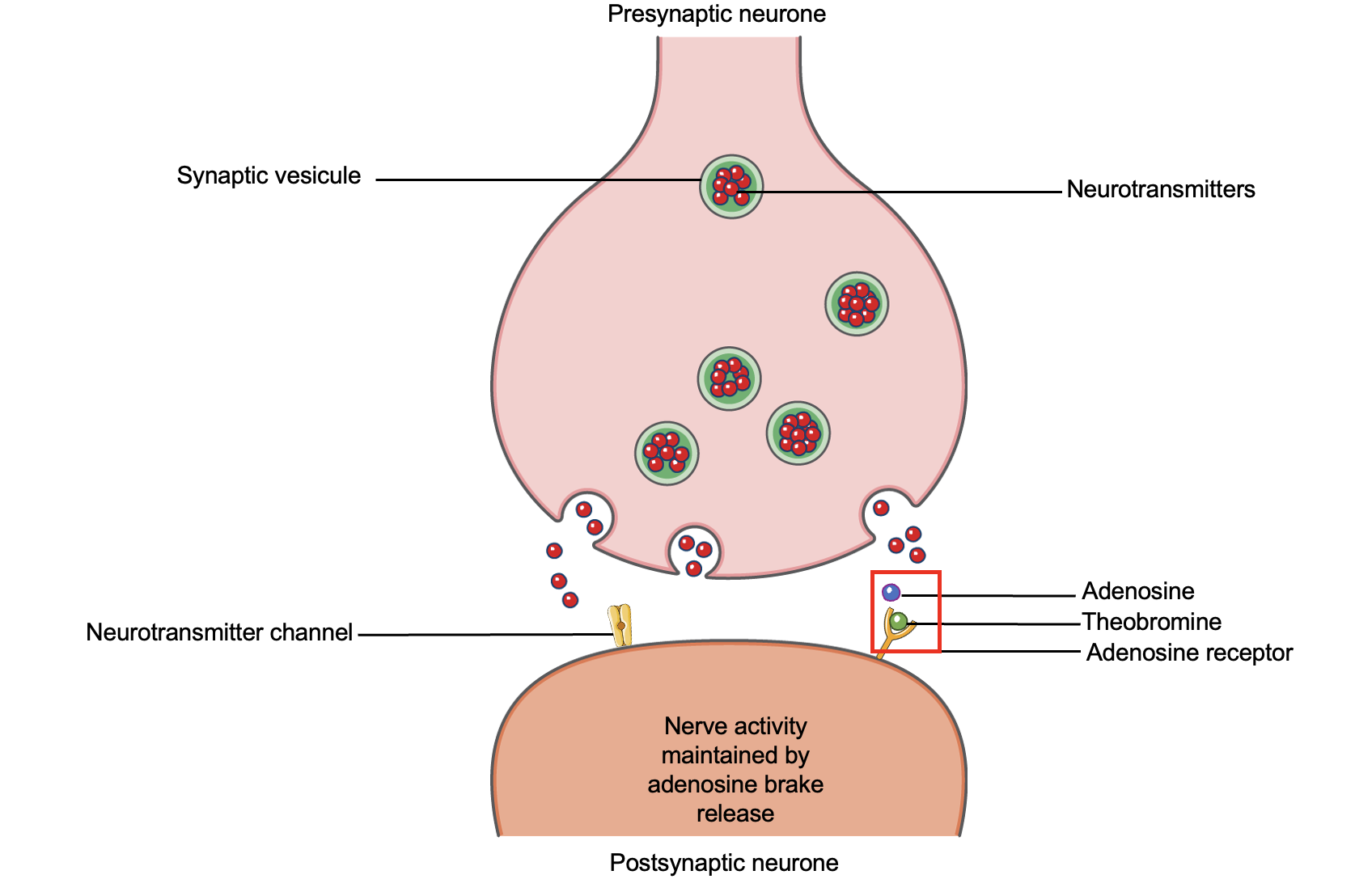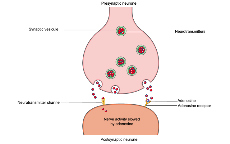 The adenosine binds to its receptor and causes the feeling of fatigue that we feel during the day. This association prevents the release of neurotransmitters (small molecules that travel in the brain) and causes a slowing down of the muscles and brain.