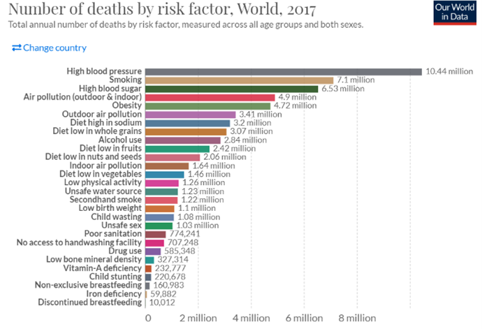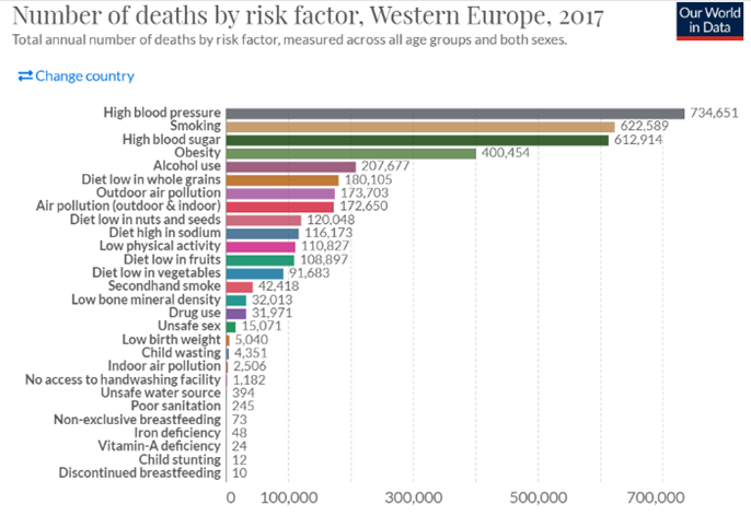 Figure 1: Number of deaths by risk factor in 2017. Graph on the left represents Western Europe, and the one on the right the whole world.