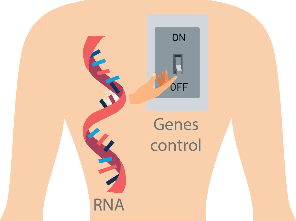 These 98% contain small molecules of RNA and in particular of interfering RNA. This part of non-coding DNA or DNA is called "trash" because for a long-time scientists believed that it was a residue of mutations, bacterial DNA or from viruses that had "failed" in our genetic code. But this “trash” DNA is far from useless: it forms the epigenome. The set of genes which determine the epigenetic modifications of a cell thanks to the RNA molecules circulating in our body and acting as chemical on / off switches. These RNAs can control genes and thus triggering or "switching off" actions controlled and carried out by cells.
