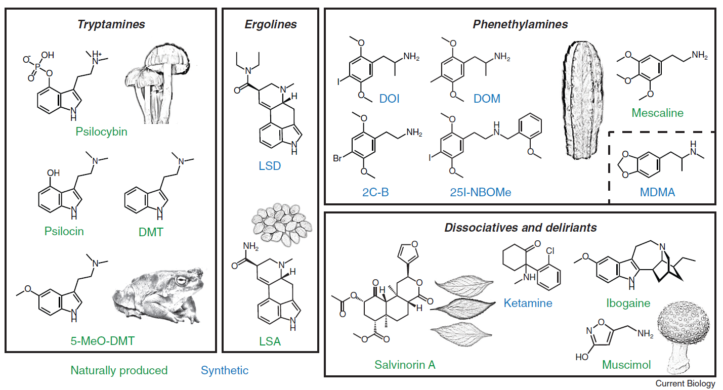 Illustration of the different families of psychedelic compounds according to their chemical structures and origins