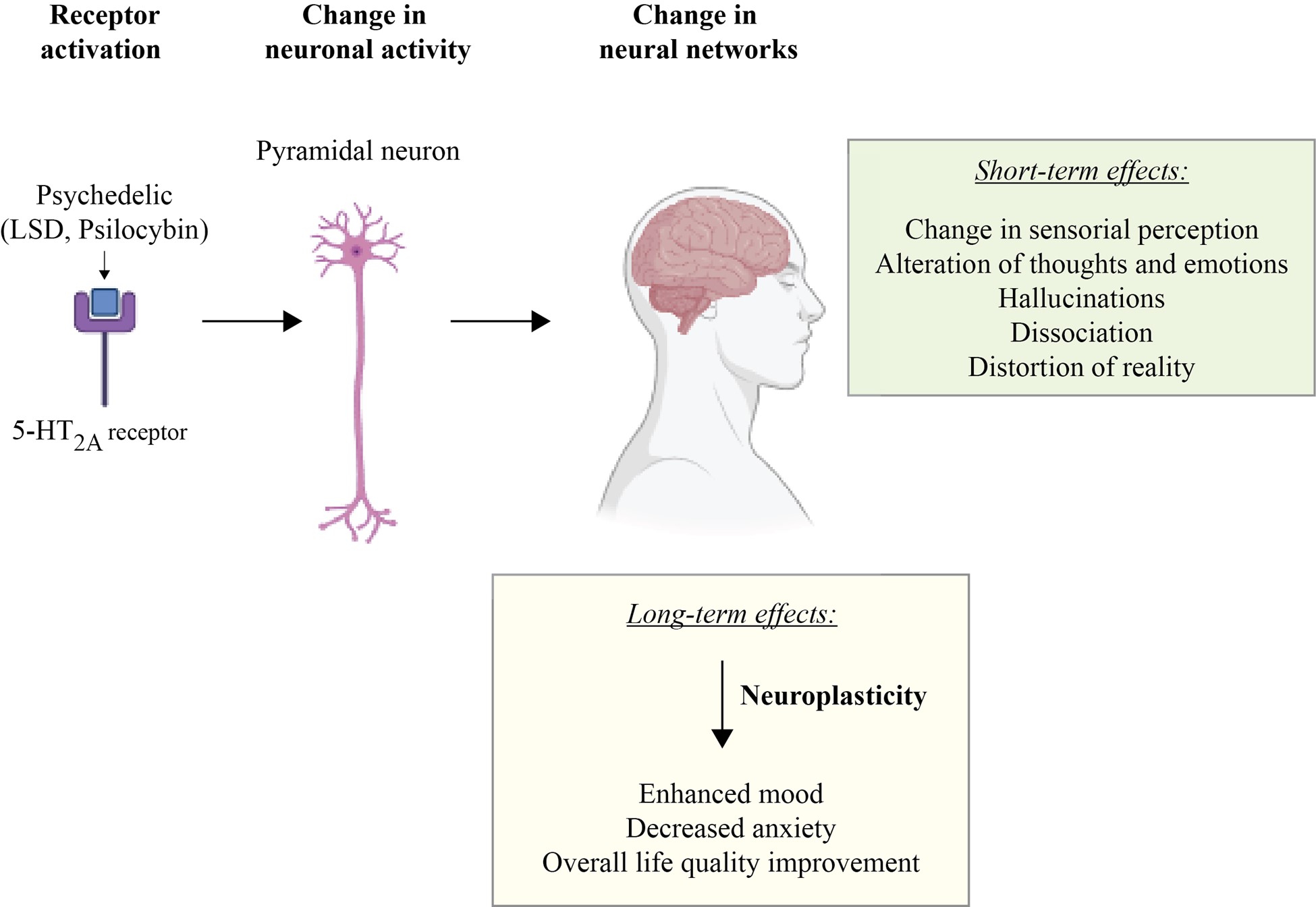 Diagram representing the mechanisms of action of psychedelics and their short-term and long-term effects