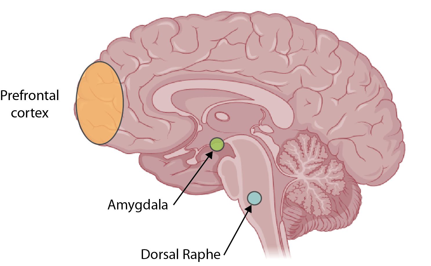 Illustration of the human brain with the prefrontal cortex, the amygdala and the dorsal raphe nucleus