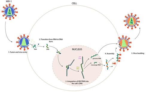 Diagram of the reproduction of a virus (HIV-1) within a host cell
