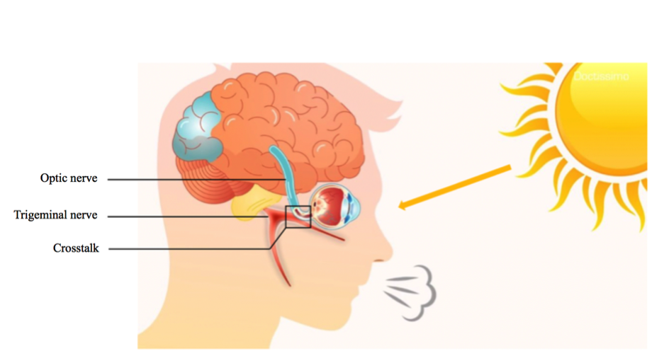 Light enters the eye and is transmitted to the brain by the electrical impulse. Which is very close to the trigeminal nerve. When an electrical impulse arrives sharply, as at the time of a sudden exposure to the sun, it can be transmitted to the branches of the trigeminal nerve in the vicinity, like a pebble thrown into a pond which cause a succession of ripples. This propagation of the electrical impulse in the trigeminal nerve activates the sneeze reflex.