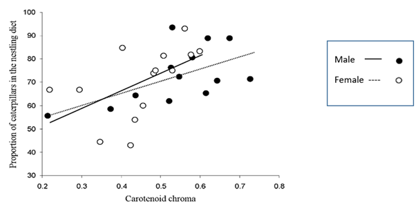 Relationship between the proportion (%) of caterpillars delivered to the young and adult plumage yellow coloration (carotenoid chroma) for male and female blue tits. ( et al, 2012)