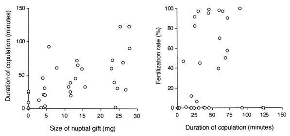Figure showing respectively the relationship between size of the nuptial gift and duration of copulation (left figure) and between the duration of copulation and percentage of fertilized eggs (right figure). (STÅLHANDSKE, 2001)