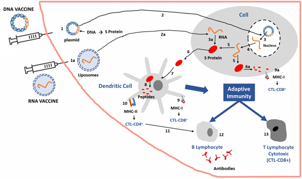 Figure 4: DNA or RNA vaccines mechanisms (Source: https://www.scienceaujourlejour.fr/pages/coronavirus-de-wuhan/la-course-aux-vaccins.html)