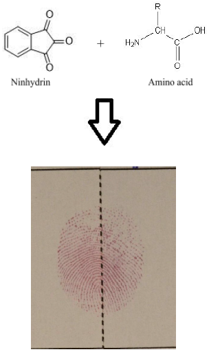 Among these techniques, we find one of the best known and used, ninhydrin. It has long been used to reveal latent traces on paper supports and acts on amino acids. This is how an amino acid is written: