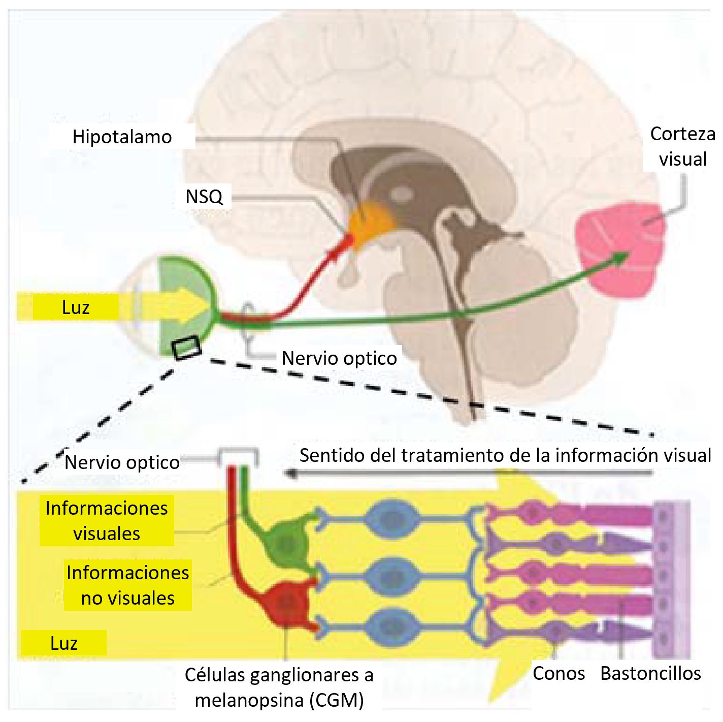 En el fondo de nuestro ojo se halla la retina, membrana compuesta de fotorreceptores que son los conos, que permiten la visión de los colores, y los bastoncillos, que permiten la visión de noche en blanco y negro. Estos fotorreceptores transmiten una señal nerviosa a la corteza visual, gracias a la cual el cerebro construye una imagen mental de nuestro alrededor. Pero no es todo: los conos y los bastoncillos también se conectan a unas células especiales: las “células ganglionares a melanopsina”. Estas reaccionan a las variaciones lentas de luminosidad, y están relacionadas a los núcleos supraquiasmáticos (NSQ). Así, la luz del día activa el envío de la señal nerviosa a nuestro reloj biológico. Al contrario, cuando es de noche, esta señal se interrumpe. Gracias a este estímulo exterior, el reloj biológico es capaz de sincronizarse en 24 horas. También es por este fenómeno que nuestro cuerpo puede adaptarse en unos cuantos días a un desfase horario.