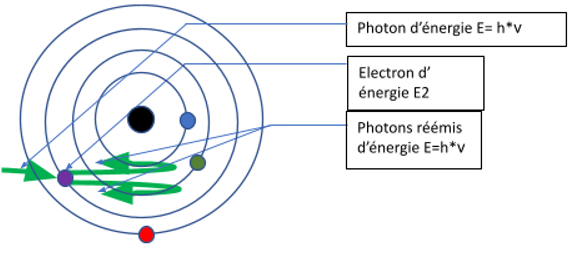 A continuación, el vínculo con los láseres : cuando un electrón que presenta un nivel de energía E1 recibe un fotón (de energía E=hv), el electrón va a absorber la energía del fotón. Pasa entonces a un nivel E2. Se habla de absorción. En esta fase, el electrón gana en energía y pasa a otro nivel.