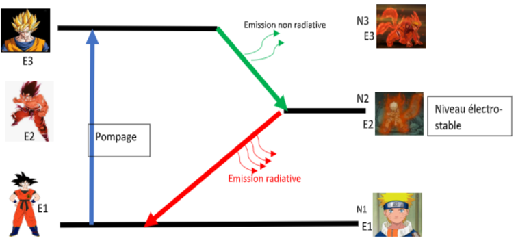 Para los electrones, es el mismo fenómeno. Absorben fotones y pasan de un nivel E1 a un nivel E3. Luego van a liberar energía para pasar a un nivel E2, que se ubica entre el nivel E1 y E3. Esta liberación de energía es una emisión no radiactiva, lo que significa que liberan una energía que no es visible. Para terminar, para pasar del nivel E2 al nivel E1, liberan energía bajo forma de fotones de una frecuencia especifica. Esta emisión es la emisión radiactiva. Es nuestra famosa emisión LÁSER.