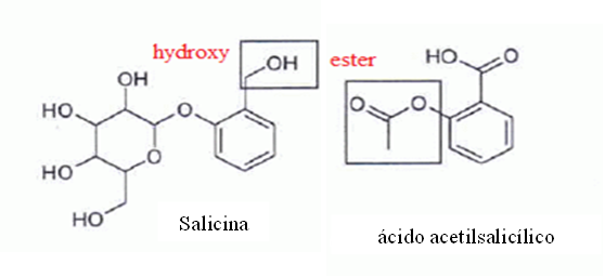 Fórmulas de salicina y su derivado ácido acetilsalicílico (http://www.chimix.net/an10/bac10/sud90.htm)