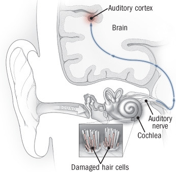 Imagen 1 : Ilustración de la oreja y de las vías auditivas hacia el cerebro. Las células ciliadas de la cóclea ayudan a transformar las ondas auditivas en señales eléctricas que irán al cerebro vía el nervio auditivo. La perturbación de esta vía puede provocar acúfenos agudos, mientras que el daño de la cóclea puede provocar una versión crónica.