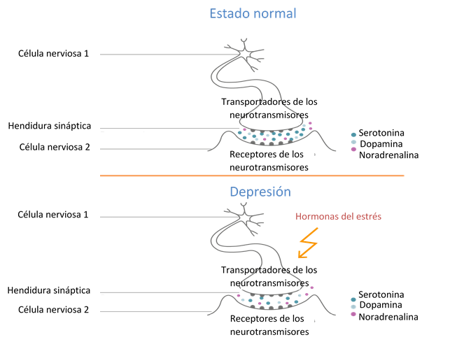 Los neurotransmisores permiten que las neuronas se comuniquen entre sí. En la depresión se observa un defecto de la neurotransmisión por la serotonina, la noradrenalina y la dopamina pero no únicamente: hay un defecto de secreción del BDNF (Brain-Derived Neurotrophic Factor, factor neurotrófico derivado del cerebro, en español) que es un factor esencial para la proliferación, la diferenciación y la supervivencia de las neuronas. El BDNF favorece la neurogénesis, es decir, la formación de nuevas neuronas, y favorece la conexión entre ellas (las sinapsis). Ni sinopsis, ni memoria, ni aprendizaje, etc. Este defecto se debe principalmente a dos cosas: