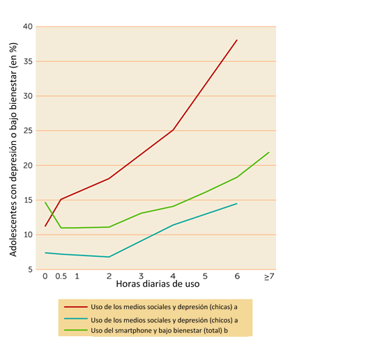 Proporción de adolescentes sufriendo de depresión o de un bajo bienestar psicológico, según el número de horas al día de uso de medios sociales o del smartphone (Fuente: Twenge, J. Increases in Depression, Self-Harm, and Suicide Among U.S. Adolescents After 2012 and Links to Technology Use: Possible Mechanisms (2020). Psychiatric Research and Clinical Practice)