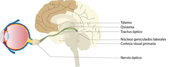 En un primer momento, la señal alcanza el quiasma óptico, luego el tractus óptico y el tálamo. Para ser más preciso, la señal va en dos núcleos llamados geniculados laterales, ambos situados en un hemisferio cada uno (uno para el derecho, otro para el izquierdo).