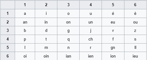 Se trata del mismo principio que para la lectura de los mapas (para los más viejos de nosotros). Por ejemplo, para escribir el sonido “on”, se trata de la casilla(2 ; 3). Entonces hay que escribir dos puntos en primera fila vertical, y luego tres en la segunda fila vertical.
