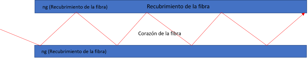 En este caso preciso, la composición del tubo de la fibra es tal que el índice del corazón es más fuerte que el índice del recubrimiento que lo rodea. Así, la luz entra con un cierto ángulo y rebota en la interfaz entre el corazón y el recubrimiento. Los rebotes se reproducen así hasta la otra punta de la fibra.