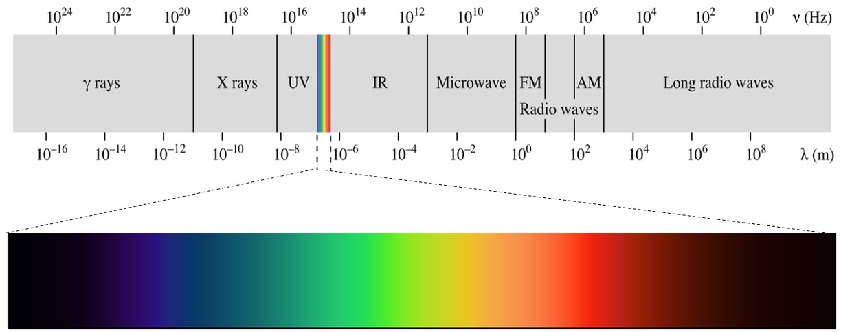 Ilustración de los rangos de longitudes de onda y de la posición del rango del visible.