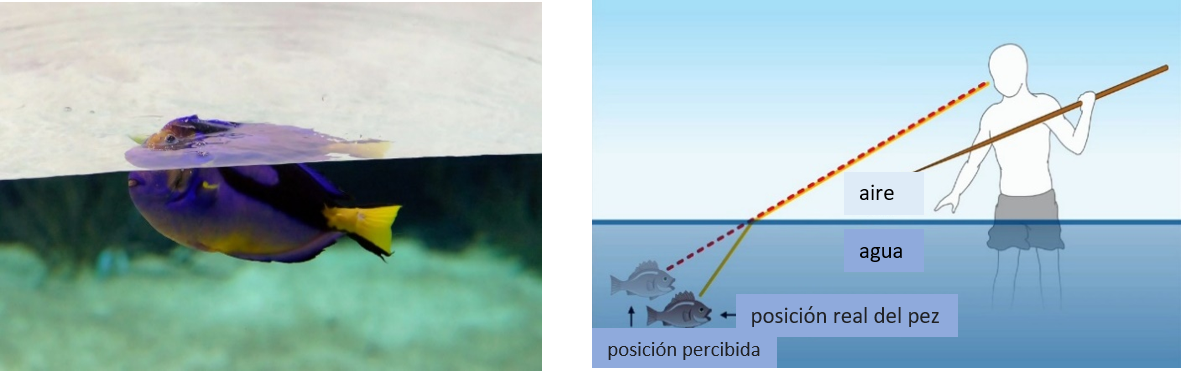 Ilustración de la refracción. A la izquierda una fotografía de la refracción sobre un pez en un acuario (Fuente : https://pxhere.com/en/photo/573761). A la derecha un esquema de la ilusión óptica causada por la refracción con un pescador (Fuente : http://munnscience.weebly.com/refraction-lab.html)
