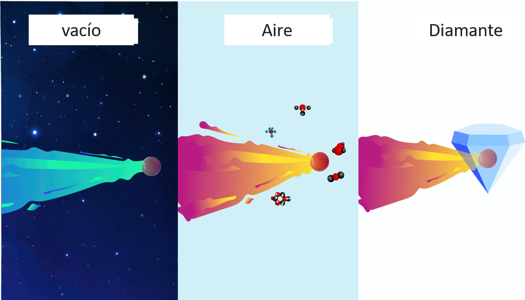 Todos los medios no se valen. Un diamante es diferente del agua, del aire o incluso del vacío. La luz no va entonces a desplazarse en ellos de la misma manera. Su velocidad es diferente.