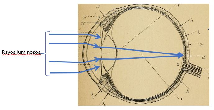 figura 2: Dibujo del ojo visto de perfil con el camino rayos luminosos