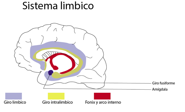 Esquema del sistema límbico con amigdala y giro fusiforme