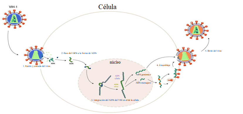 Esquema de la reproducción del virus del VIH en el seno de nuestras células