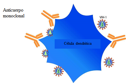 Esquema de una célula dendrítica infectada por el VIH, enfocada por los anticuerpos de la vacuna