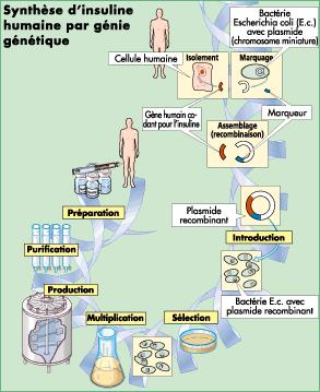 Représentation schématique du processus de production d'insuline recombinante (http://genet.univ-tours.fr/gen002300/Pour%20en%20savoir%20plus/histoire%20de%20l%20insuline.html )