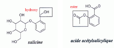 Formules de la salicine et de son dérivé l'acide acétylsalicylique (http://www.chimix.net/an10/bac10/sud90.htm)