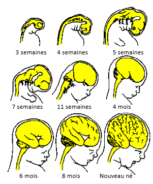 Vue schématique du développement du cerveau chez le fœtus. Les images individuelles ne sont pas à l'échelle.