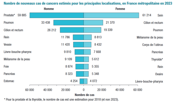 Nombre de nouveaux cas de cancer estimés pour les principales localisations, en France métropolitaine en 2023. (source : https://onconormandie.fr)