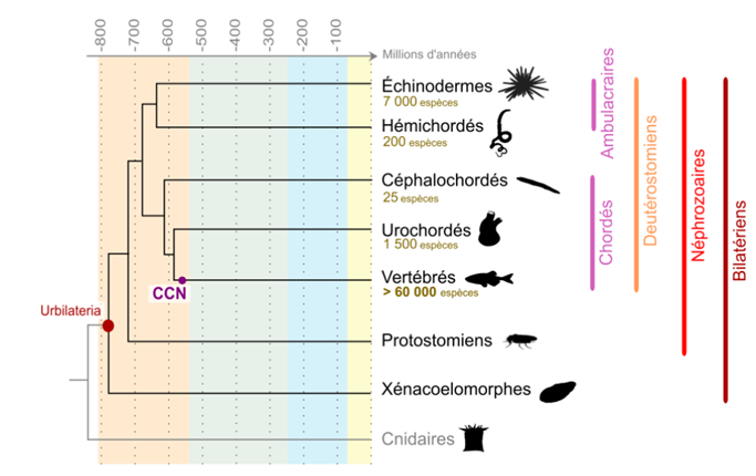 Figure 3 : Représentation schématique de l’apparition des CCN au cours de l’évolution (Source : https://planet-vie.ens.fr/thematiques/developpement/phases-du-developpement/les-cellules-des-cretes-neurales-la-seule-chose)