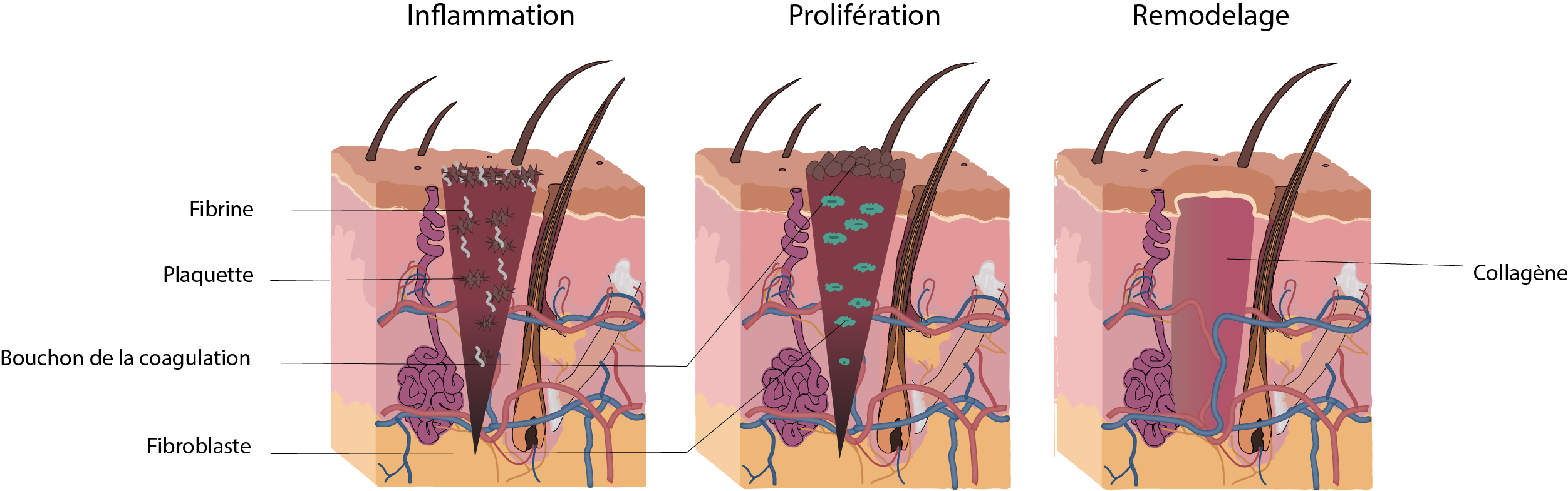 La cicatrisation est bien décrite et connue du point de vue des molécules et des cellules. Elle se présente en 3 étapes : l’inflammation, la prolifération et le remodelage.