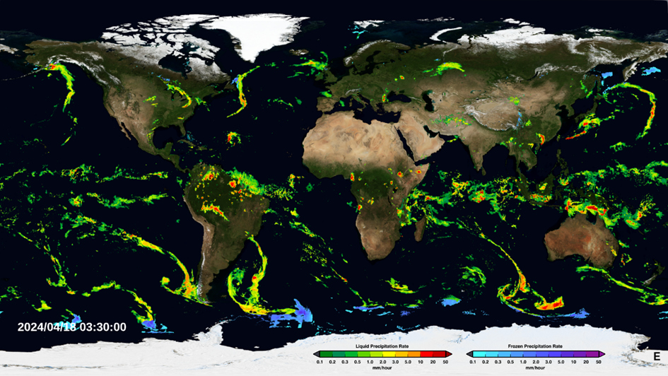 Figure Précipitations détectées par satellites le 18 avril 2024. Ce produit, appelé IMERG (Integrated Multi-satellitE Retrievals for GPM), élaboré par la NASA (National Aeronautics and Space Administration), combine les données de plusieurs satellites (géostationnaires et défilants), notamment ceux de la mission GPM (Global Precipitation Measurement), pour estimer les précipitations à l'échelle globale avec une résolution spatiale de 0,1° (environ 10 km) et une résolution temporelle de 30 minutes. Les couleurs chaudes et froide indiquent en millimètres par heure les précipitations respectivement liquides et solides.