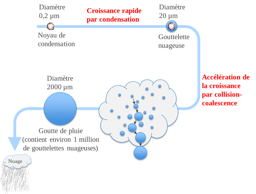 Figure 1 : Mécanisme de formation des précipitations. Le mécanisme de coalescence provoque la collision et l'agglomération d'un très grand nombre de gouttelettes et de cristaux de glace au cours de leur chute. Source : Drobinski (2025)