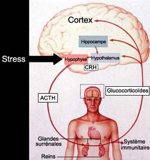 La glande hypophyse produit l’ACTH ou hormone adrénocorticotrope, qui stimule les glandes surrénales pour sécréter l’hormone du stress, le cortisol. Le cortisol, un glucocorticoïde, agit à son tour sur l’hypophyse pour diminuer la sécrétion d’ACTH. Mais il agit aussi sur le système immunitaire pour diminuer la production de molécules inflammatoires et augmenter celle de molécules anti-inflammatoires. Un stress excessif sur-stimule ce mécanisme et le système immunitaire, conduisant à la production de molécules inflammatoires, y compris dans le cerveau. Le stress est un facteur de risque commun à plus de 75 % des maladies physiques et mentales, dont la dépression, augmentant la morbidité et la mortalité de ces maladies.