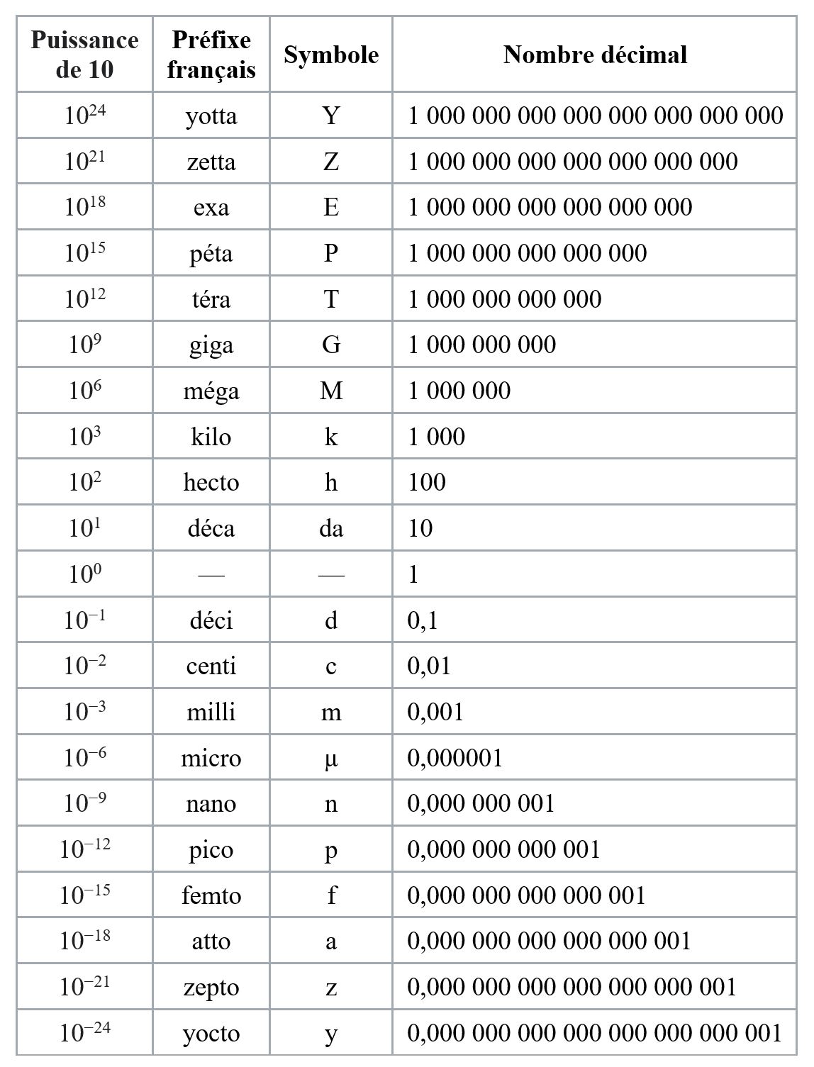 Le tableau ci-dessous rassemble l’ensemble des préfixes du Système international.