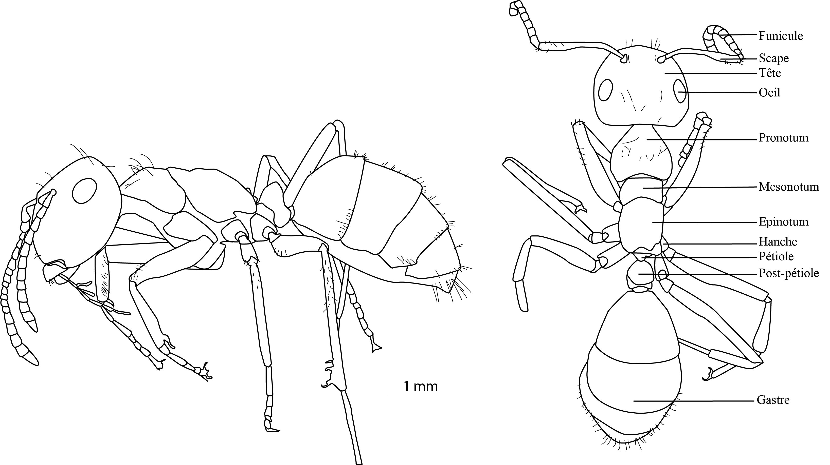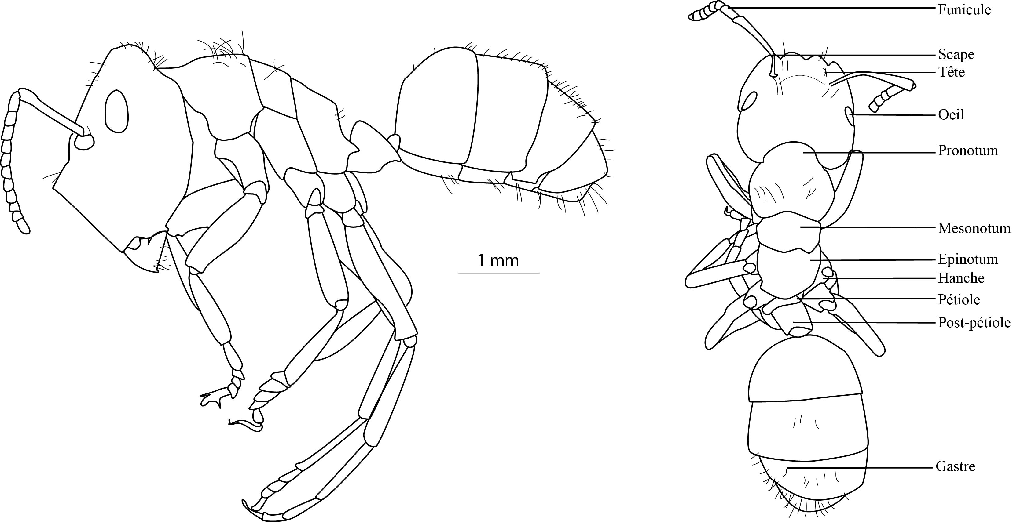 Schéma scientifique vue latérale et dorsale de C. explodens caste ouvrière mineure.