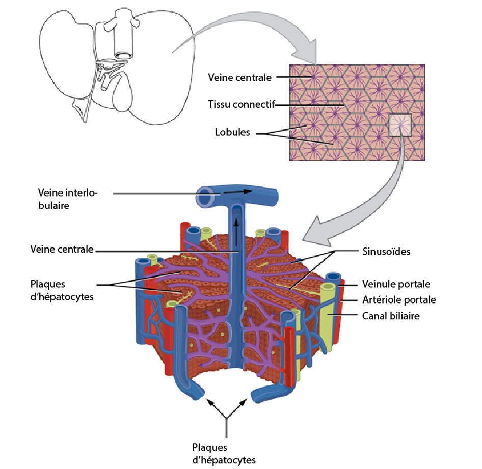 Deux grands vaisseaux sanguins siphonnent le sang dans le foie : l'artère hépatique, qui transporte le sang riche en oxygène provenant du cœur, et la veine porte, qui transporte les nutriments digérés provenant du tractus gastro-intestinal, de la rate et du pancréas. Ces vaisseaux sanguins se ramifient en sinusoïdes hépatiques, des capillaires qui forment des lobules.