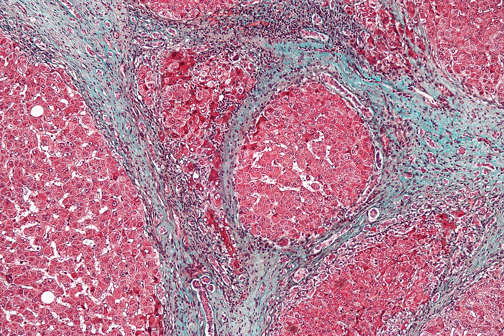 Picture 1:Micrographie montrant une cirrhose avec coloration au trichrome . By Nephron, CC BY-SA 3.0, https://commons.wikimedia.org/w/index.php?curid=7844681.